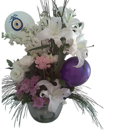 Kazablanka ve beyaz çiçeklerle hazırlanmış balonlarla süslediğimiz bebek aranjmanımız ile sevdiklerinizin mutluluğunu paylaşabilirsiniz